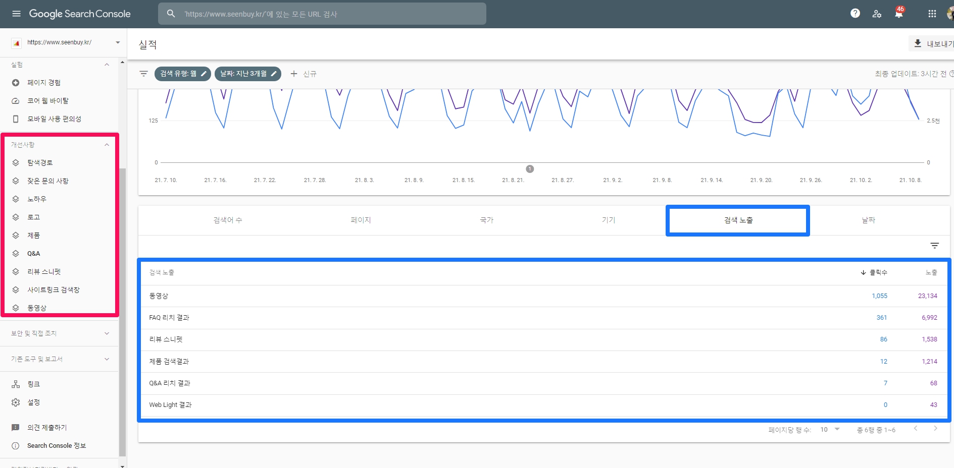 개선사항에 webpage schema는 표시되지 않습니다. (분홍색 네모칸). 검색노출(파랑색 네모칸)에도 webpage schema는 표시되지 않아서 추적이 불가합니다.