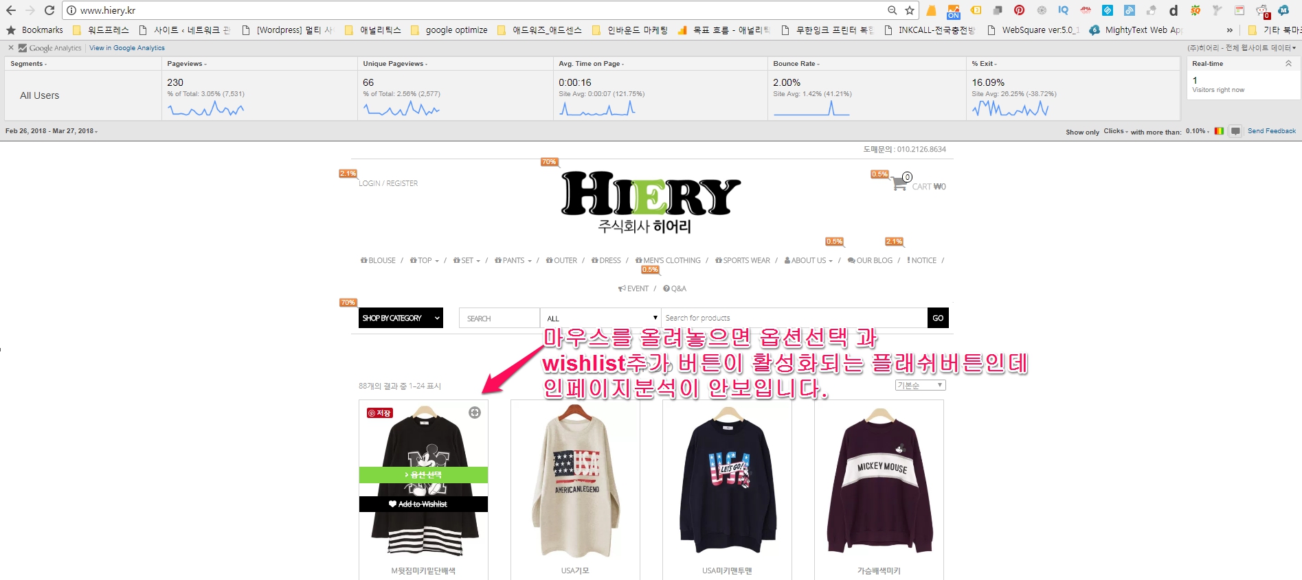 상기 인페이지 애널리틱스를 사용하기위한 조건들에서 언급하였던 부분인데 플래쉬 허락하여도 플래쉬버튼을 사용하는 url은 추적하지 못합니다. 아래의 쇼핑몰은 상품위에 마우스를 올려놓으면 ‘옵션선택’ 버튼과 wishlist에 추가’버튼이 보여지는 플래쉬버튼을 사용하고 있는데 이미지와 같이 클릭률이 나타나지 않는 한계를 볼 수 있습니다.