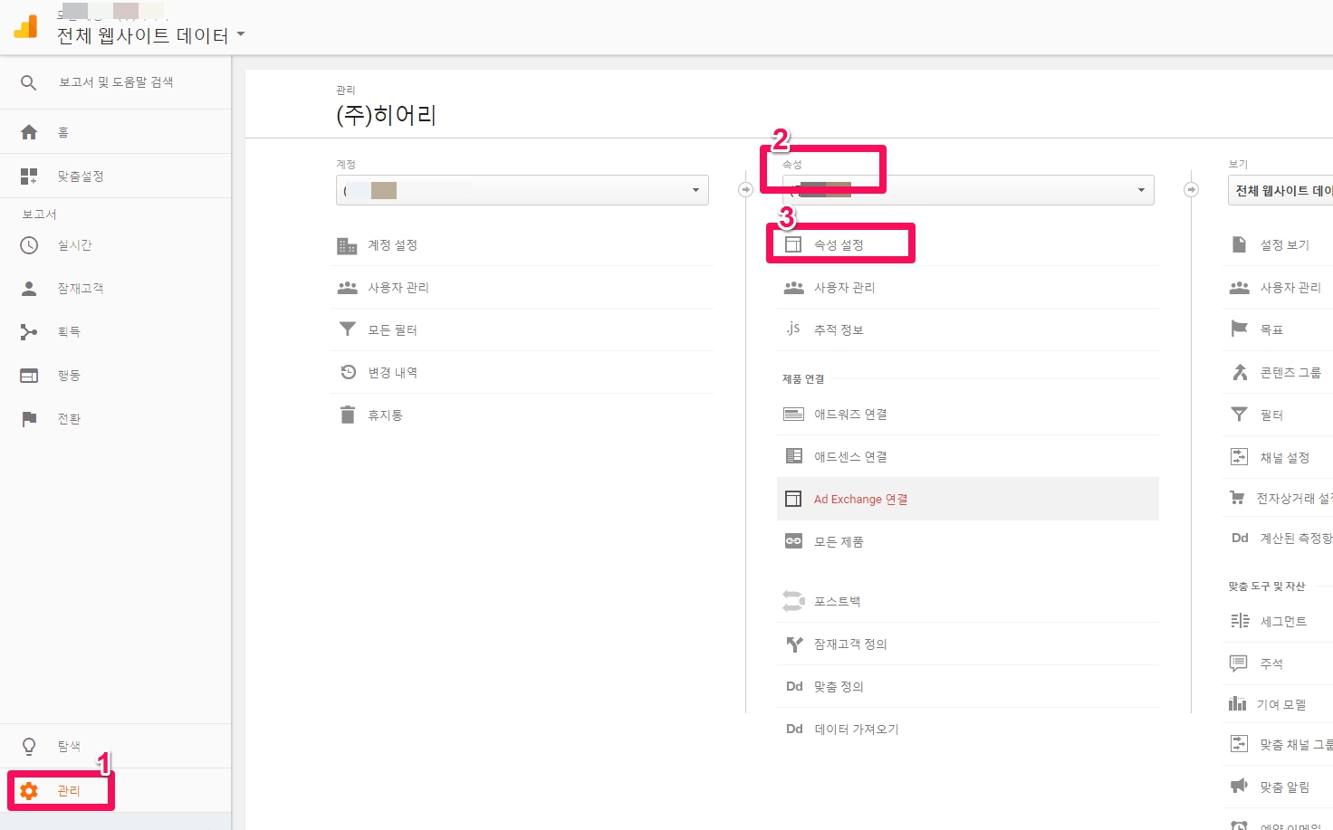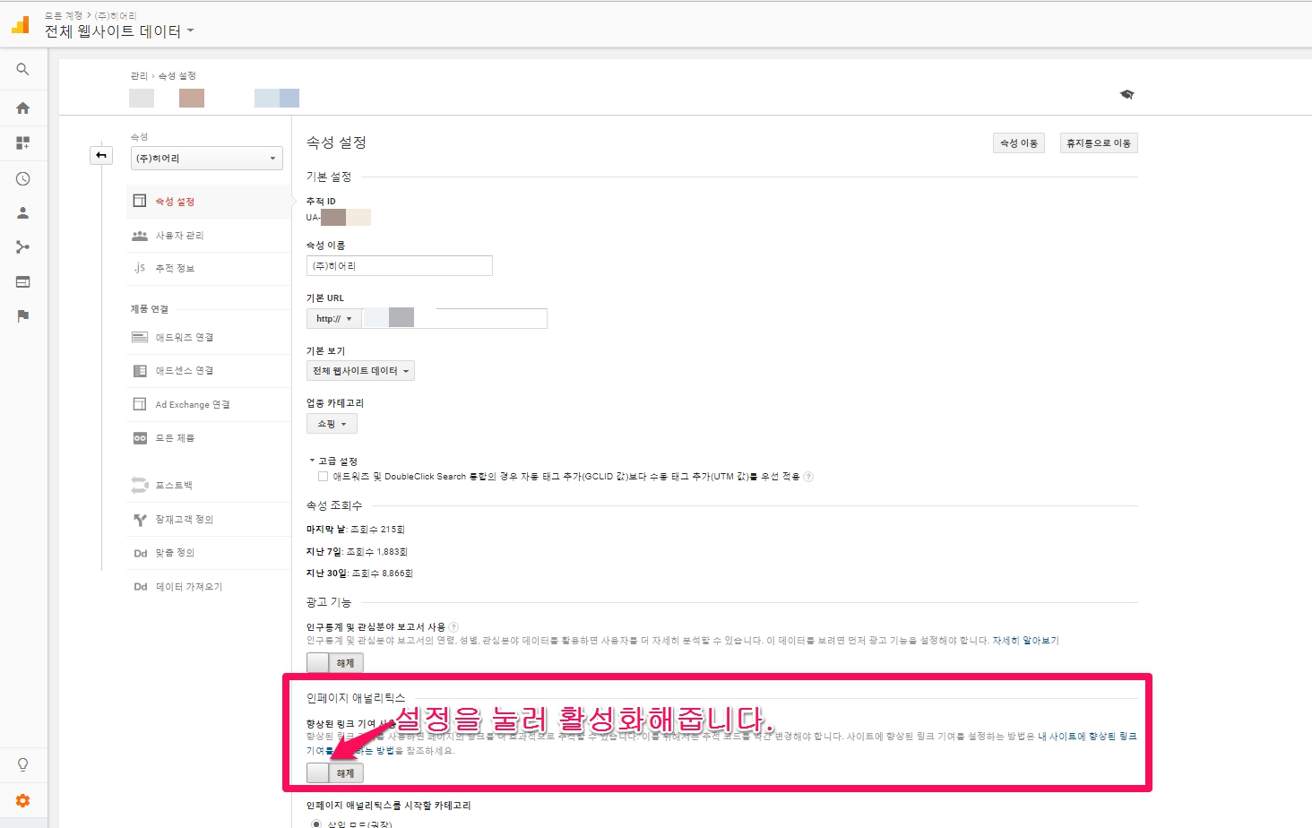 구글 애널리틱스에서 [관리] -> [속성] -> [속성 설정]으로 이동합니다.