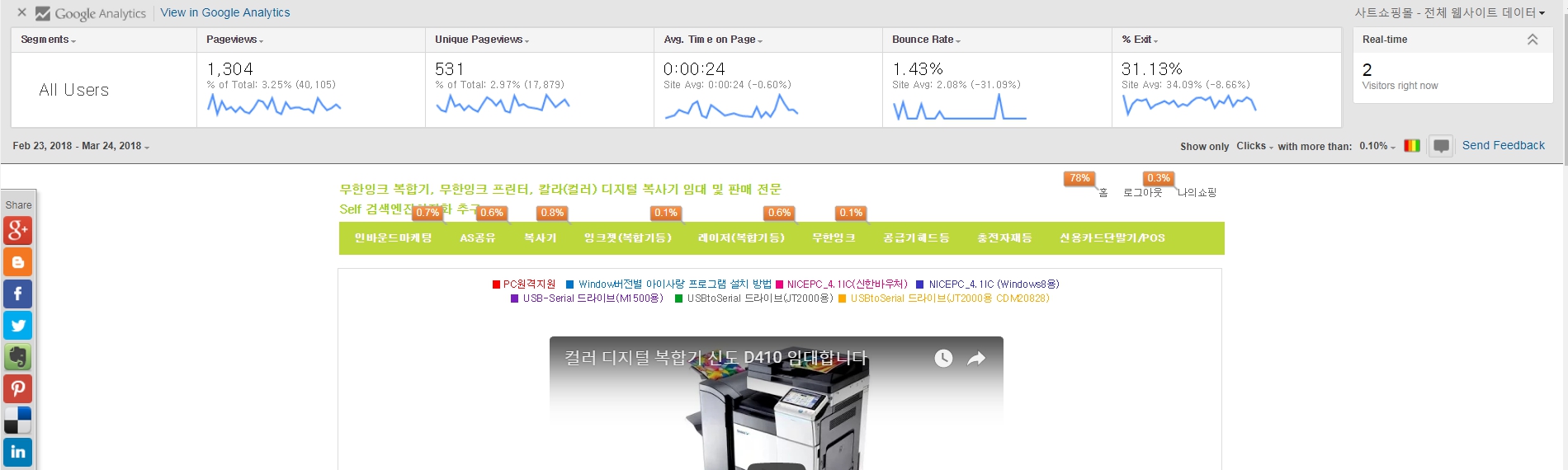 아래의 페이지는 제가 운영하는 사무기기를 판매 및 임대하는 사이트입니다. 복사기, 잉크젯(복합기등), 레이저(복합기등), 무한잉크, 공급기헤드등, 충전자재등을 판매하고 있지만 고객이 찾는 상품카테고리는 0.6%로 클릭률이 가장 높은 “무한잉크”을 알 수 있습니다.