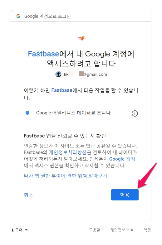로그인 버튼을 클릭 한 다음 fastbase 앱을 [허용](Google 계정 자격 증명)해주세요.