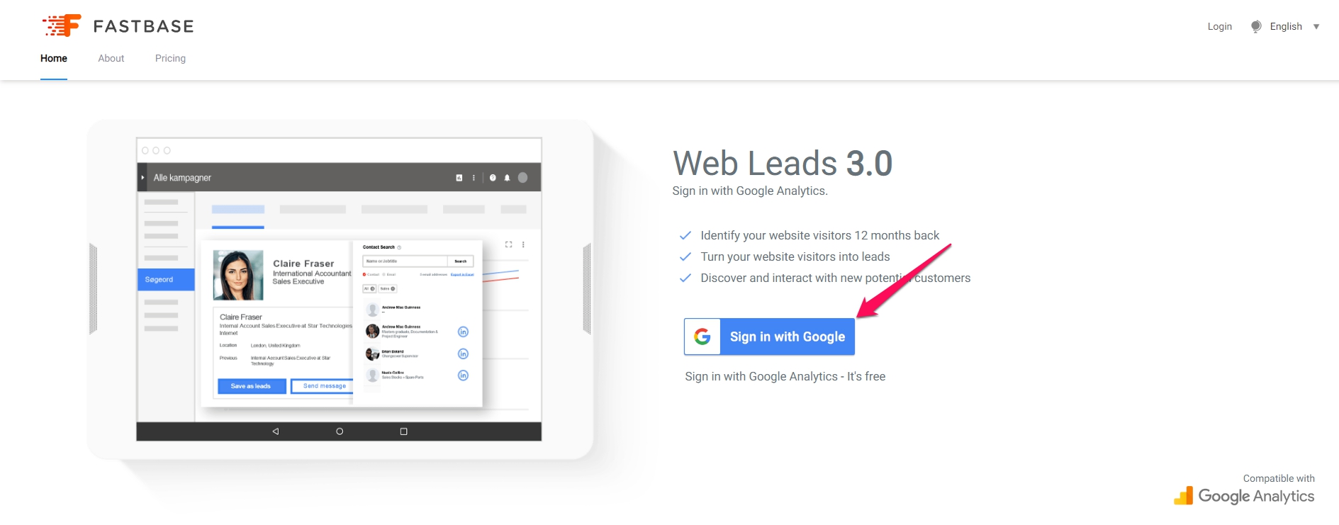 Identify who is responding to your Google Ads campaign with the new Fastbase Premium for Google Analytics. Leverage your Google Analytics with the Fastbase Premium software to get a daily report of your Google Ads leads. Our intelligence software will identify Google Ads visitors from all over the World. Sign in with Google Analytics