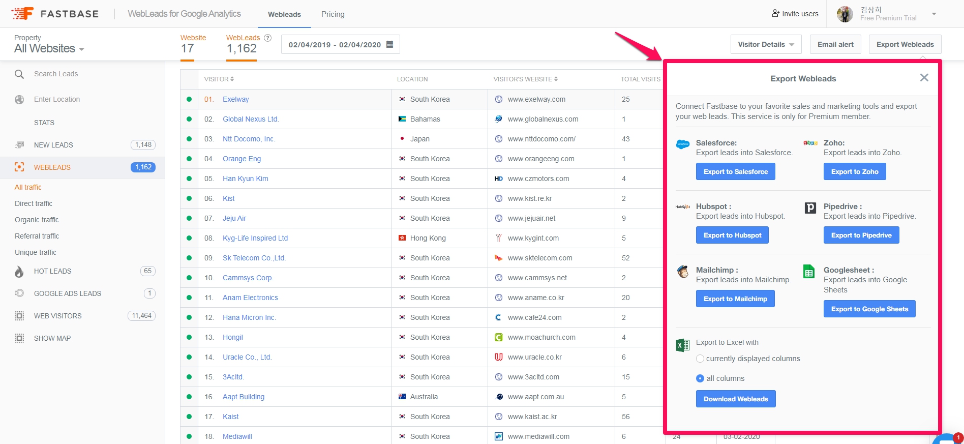 프리미엄 서비스를 이용하시면 Salesforce, Zoho, Hubspot, Pipedrive, Mailchimp와 같은 세일즈 또는 마케팅 도구들과 연결할 수 있으며 그리고 구글 스프레드시트로 내보내기도 가능합니다.