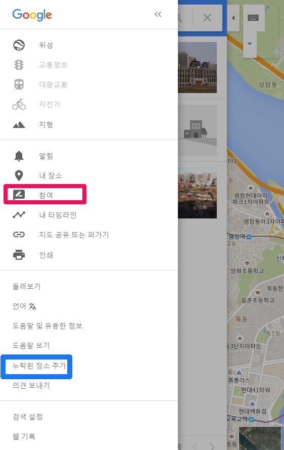 구글 지도에서 왼쪽 맨 상단에 [메뉴 ]를 click -> [누락된 장소 추가]