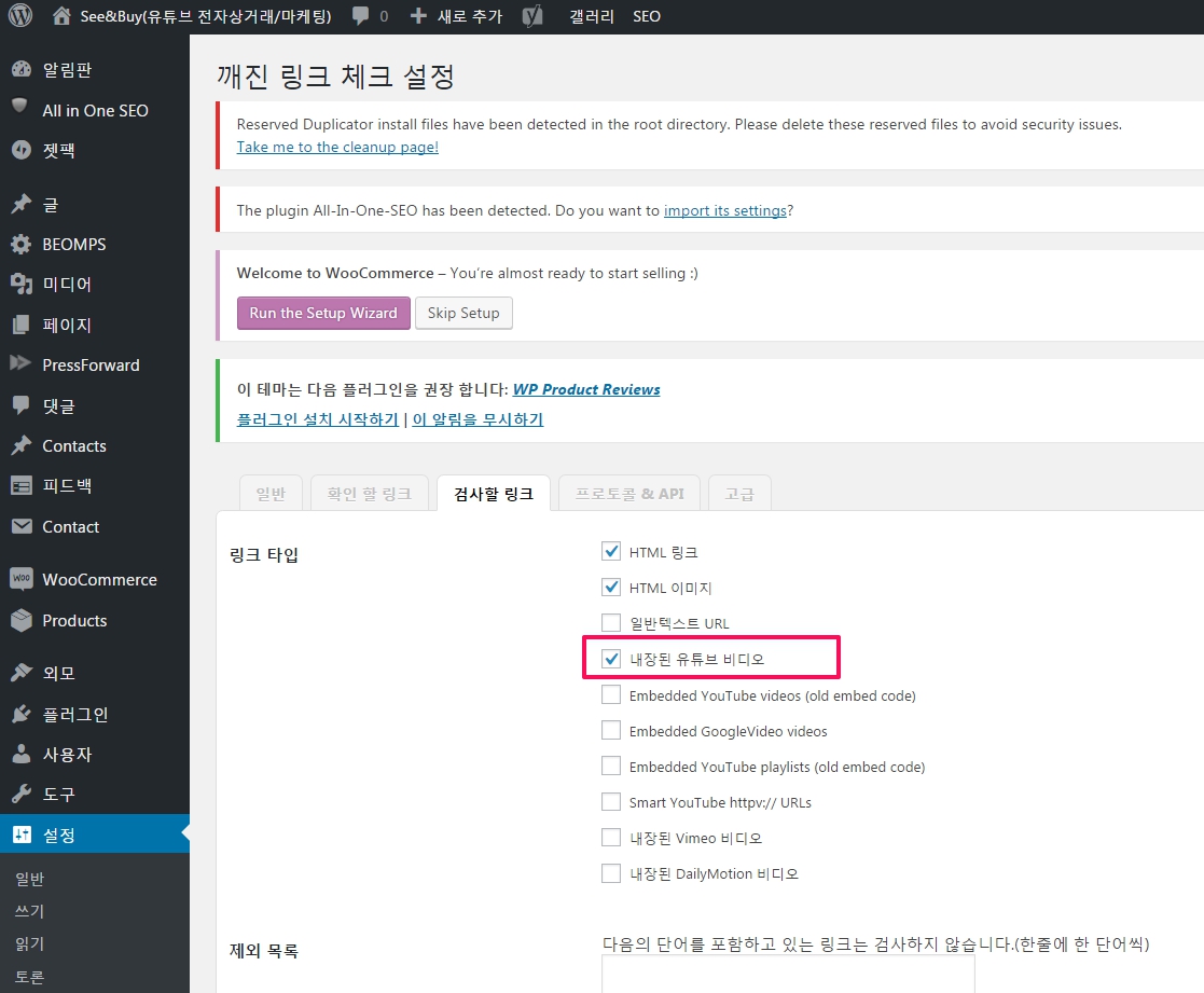 글을 작성할때 유튜브 동영상을 많이 포함한다면 동영상도 함께 점검하는 것이 좋습니다. [설정 -> 검사할 링크]에서 ‘내장된 유튜브 비디오 항목’에 체크하세요.