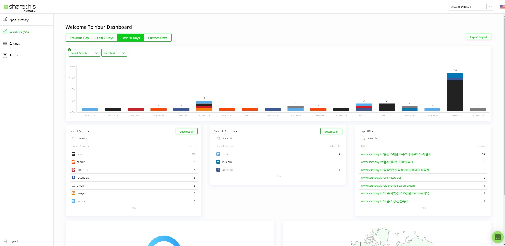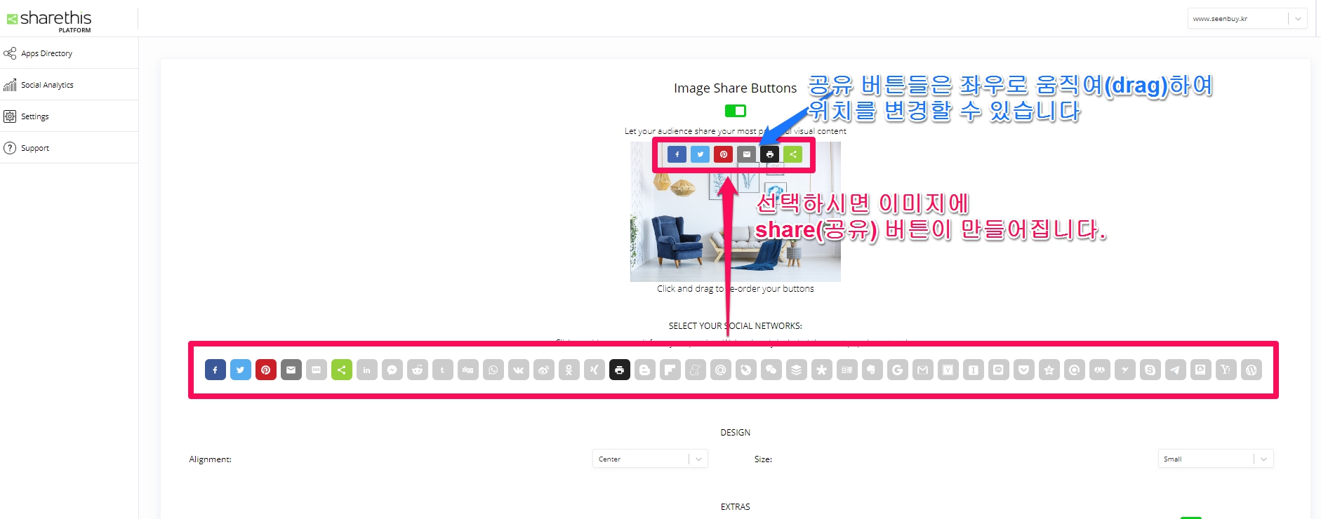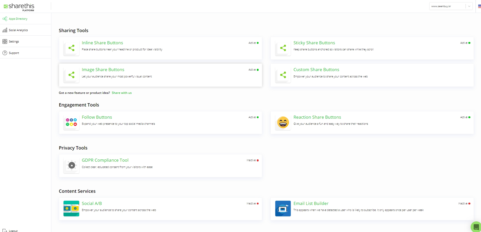 대시보드에 해당하는 https://platform.sharethis.com/apps 에 접속하시면 각종 추가기능을 설정하여 이용할 수 있습니다.