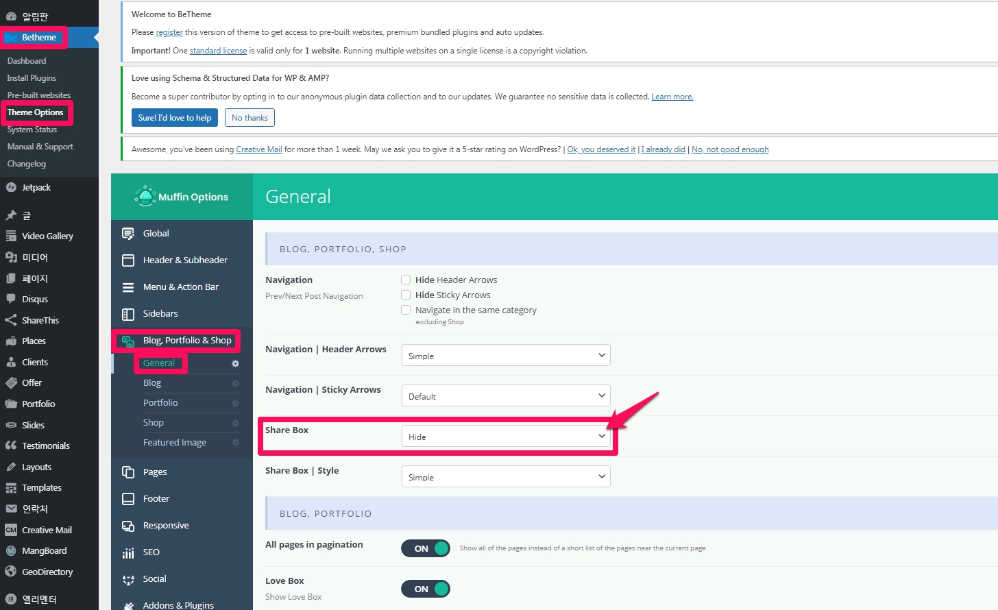 워드프레스 관리자 페이지에서 [Betheme] -> [Theme Options] -> [Blog, Portfolio & Shop] -> [General] 에서 [Share Box] 옵션을 Hide 로 변경해주세요.