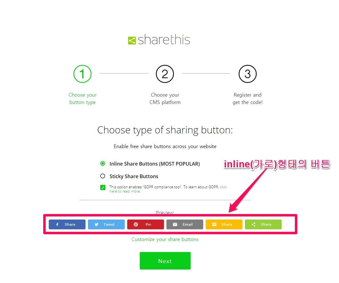 우선, 쉐어디스(http://www.sharethis.com ) 에 접속후 “Start with Share Buttons”를 선택하여 다음으로 넘어갑니다.