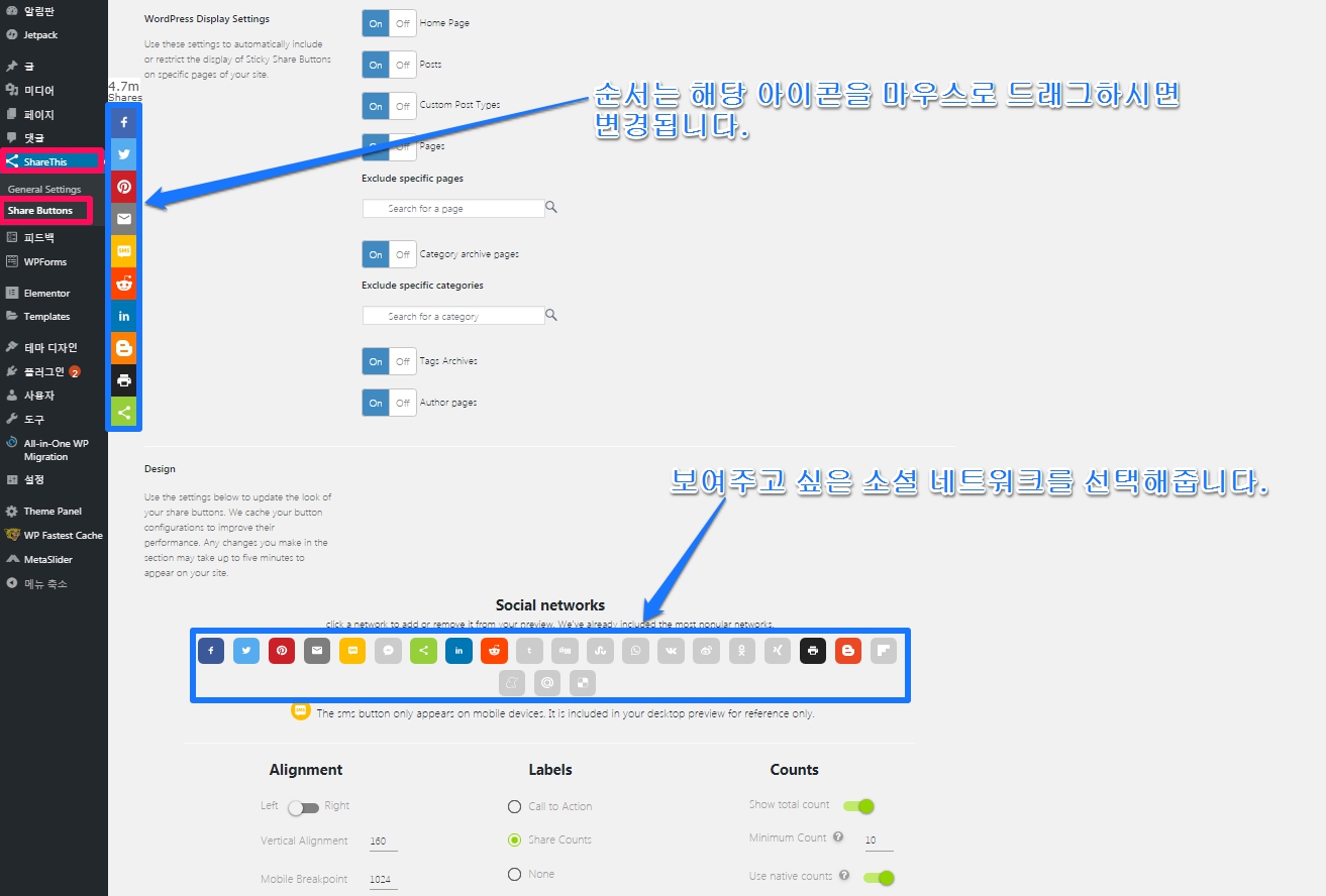 플러그인 -> 플러그인 추가설치 -> 검색창에 sharethis 입력 -> 설치 및 활성화