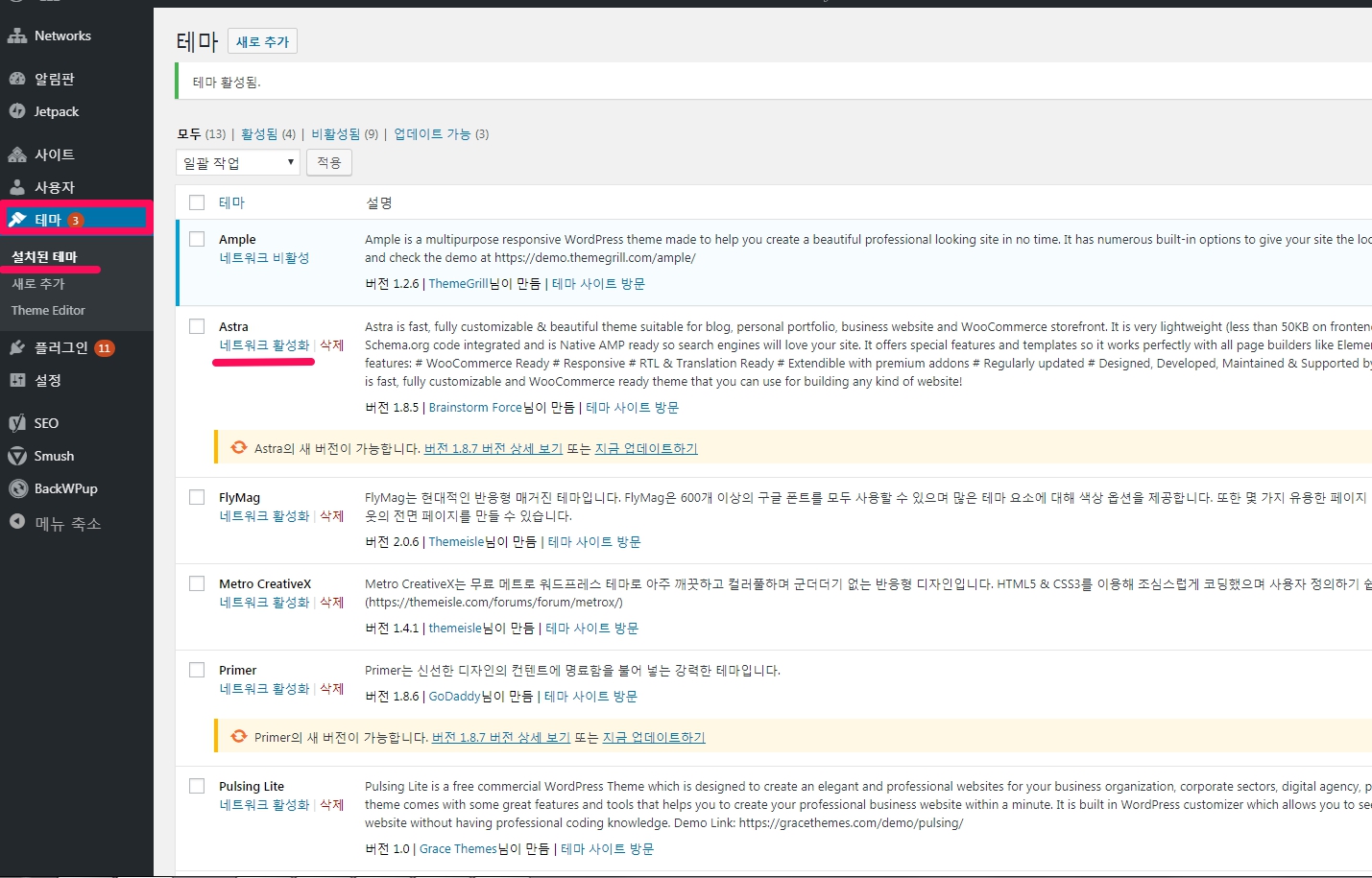 이밖에도 설치한 플러그인들중에는 네트워크단에 설정하는 플러그인들인 [Jetpack], [Yoast SEO], [Smush], [BackWPup]등이 표시되며 이 들 플러그인들을 네트워크 단에서 운영 관리할 수 있습니다.