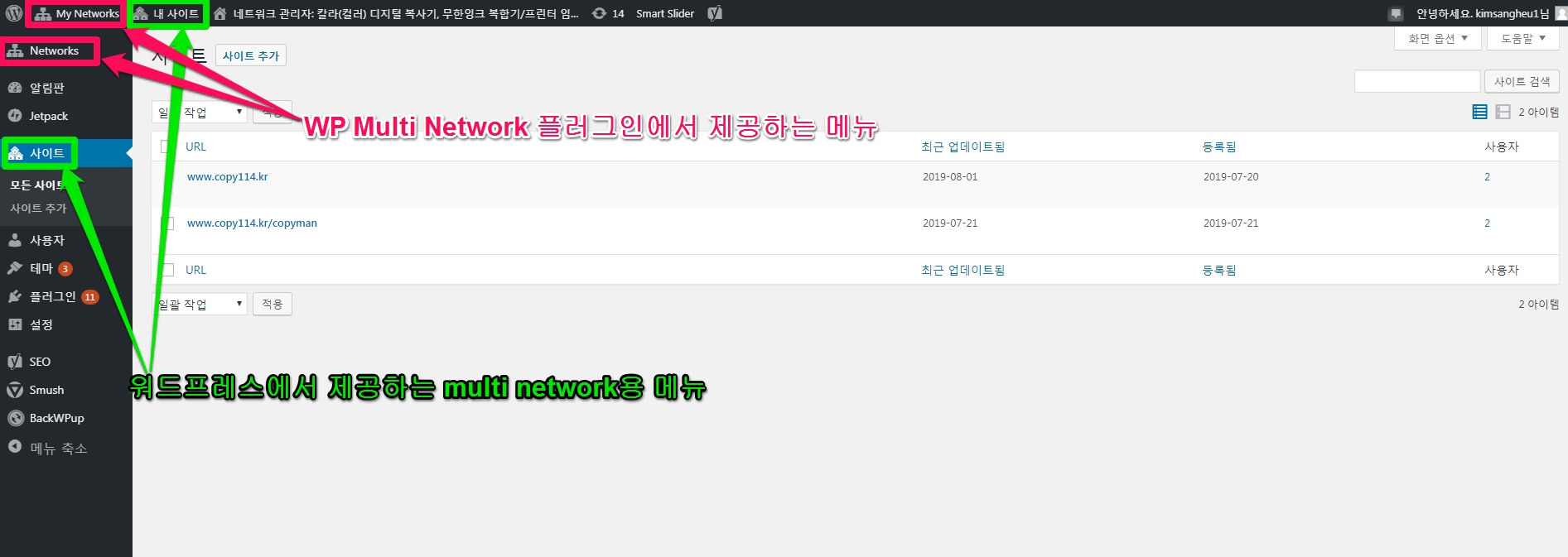 WP Multi Network 플러그인 을 설치하신 경우, 워드프레스에서 제공하는 초록색 메뉴외에 분홍색 메뉴가 추가 생성되는데, 초록색과 분홍색을 구별하여 이용하시기 바랍니다.
