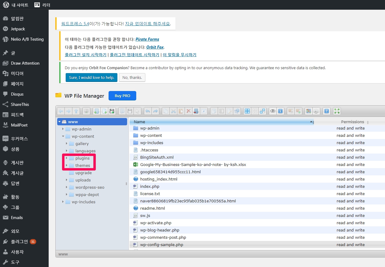 WP File Manager 플러그인을 이용하여 wp-content 디렉토리 밑에 plugins 와 themes 디렉토리를 다운로드합니다.