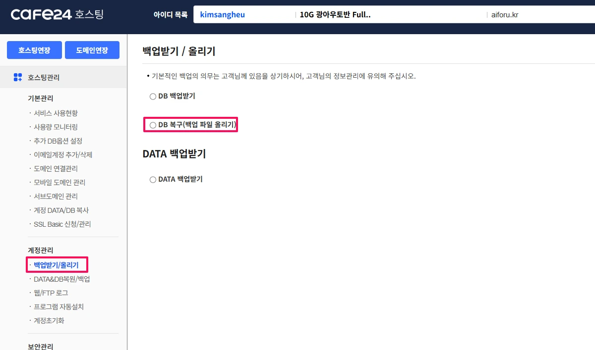 [백업하기]로 생성된 파일의 형식은 20100101_username_DATA_DB_Backup.sql (선택날짜/아이디/DB/Backup.sql) 입니다.