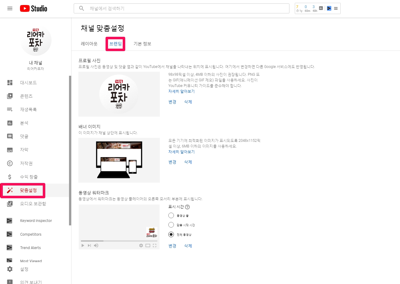 프로필 사진, 배너 이미지, 동영상 워터마크를 설정하여 브랜딩할 수 있습니다. (브랜드를 알릴 수 있습니다.)