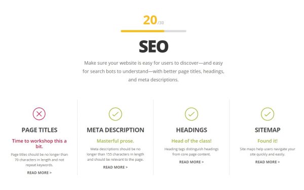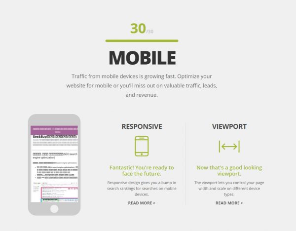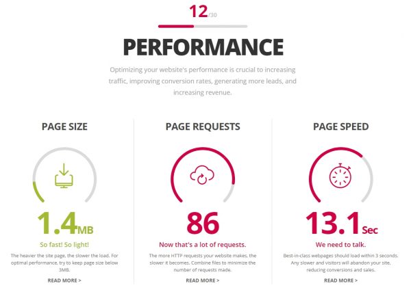 아래와 같이 시각화되어 결과 나옵니다. 부족한 부분이라고 표시된 부분의 [READ MORE] 를 선택하시어, 페이지가 나오면 구글 번역하시어 살펴보시고 조회한 사이트의 부족한 부분을 해결하세요. 시각화는 훌륭하나, 분석 요소가 10여개 밖에 안되는 점이 아쉽습니다.