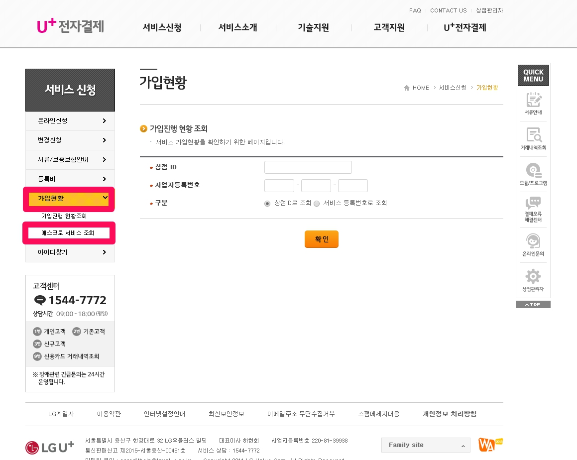 LGU+ 홈페이지 에 접속하신후, [가입현황] -> [에크크로 서비스 조회]로 이동하시어 상점ID, 사업자등록번호 그리고 구분을 선택하신후 [확인]하시면