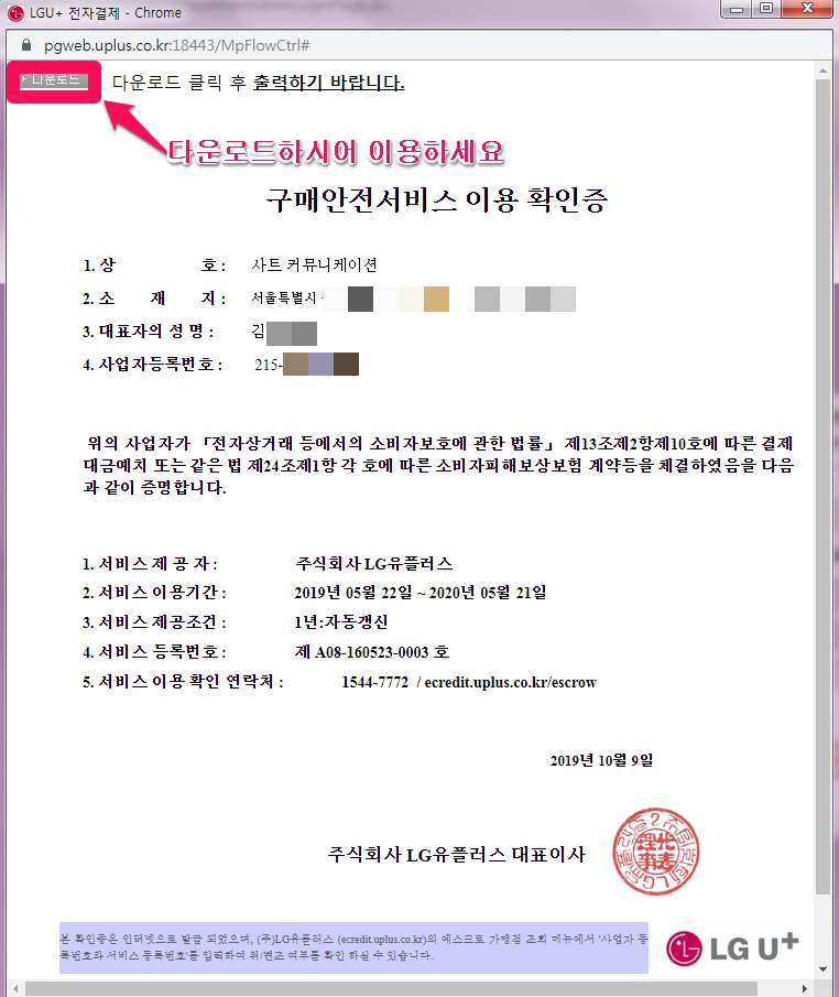 아래와 같이 구매안전서비스 이용 확인증이 표시됩니다. 상단의 [다운로드]를 눌러 다운로드 후, 통신판매업 변경신고에 첨부서류로 첨부해주세요.
