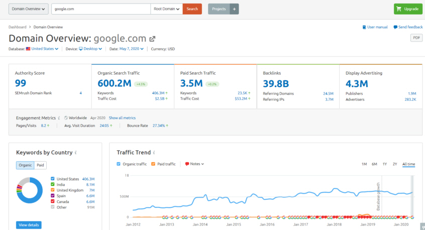 SEMRush는 모든 마케팅 담당자가 살펴볼 수있는 유용한 도구입니다. 전체 플랫폼은 Google에서 사이트의 검색 트래픽 및 실적을 신속하게 분석할 수 있도록 설계되었습니다.
