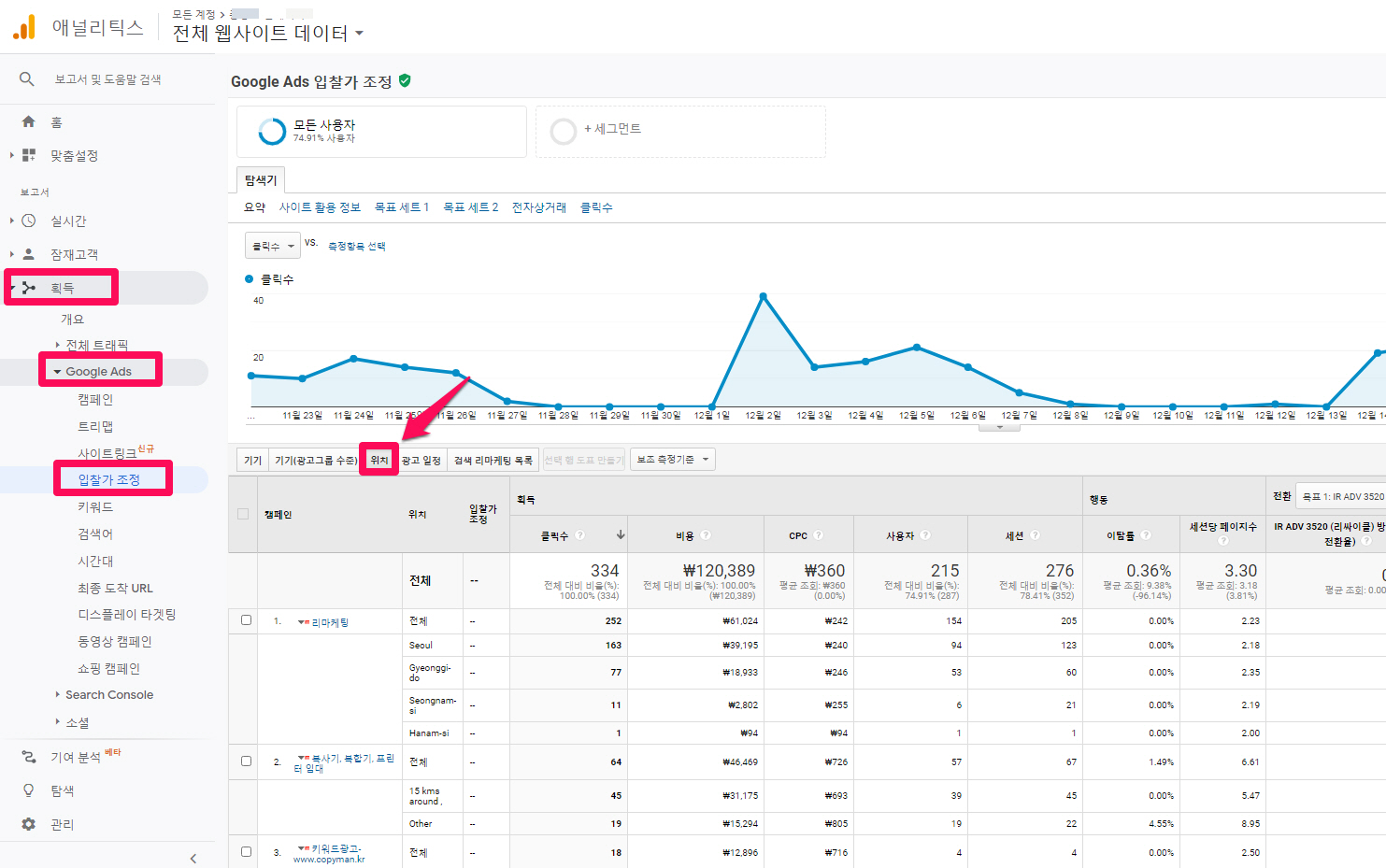 위에 이미지 설명에는 없으나 어디서 잠재고객은 내 광고를 클릭하는가가 궁금하다면 [획득] -> [Google Ads] -> [입찰가 조정]에서 필터를 [위치]로 설정하시면 보실 수 있습니다.