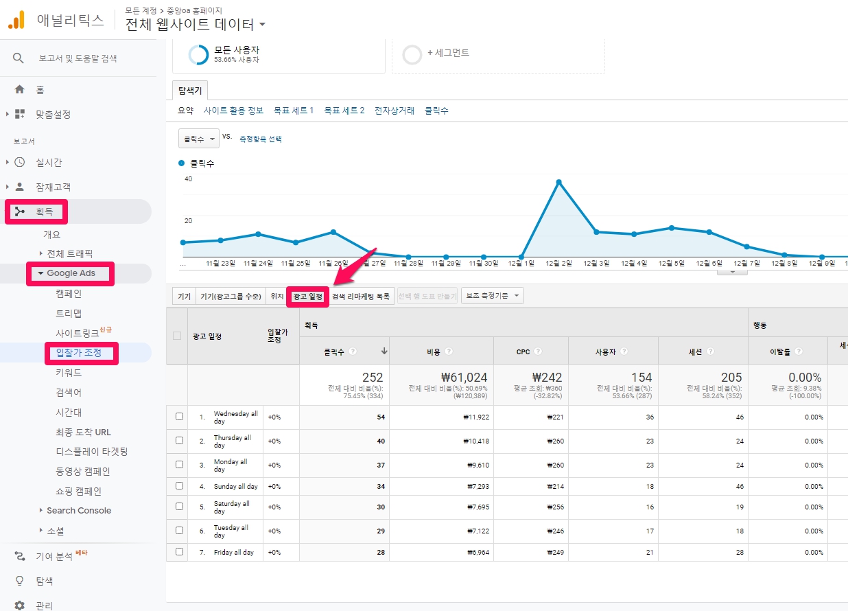 바로 위에 이미지 설명에는 없으나 어디서 잠재고객이 내 광고를 클릭하는가가 궁금하다면 [획득] -> [Google Ads] -> [입찰가 조정]에서 필터를 [광고일정]으로 설정하시면 보실 수 있습니다.