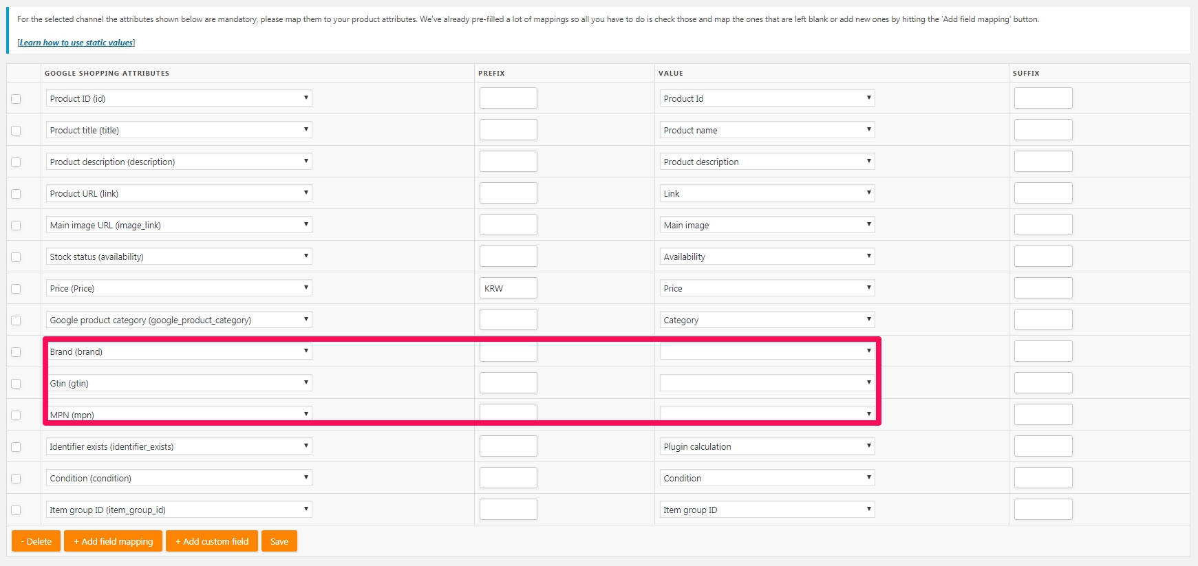 1. 선택한 채널(google shopping feed)의 필수항목들이 아래와 같이 표시됩니다. 우커머스의 Value(값)들이 자동으로 매칭되어 있는데, 분홍색 부분에 (Brand(brand), Gtin(gtin), MPN(mpn))은 빠져있습니다.