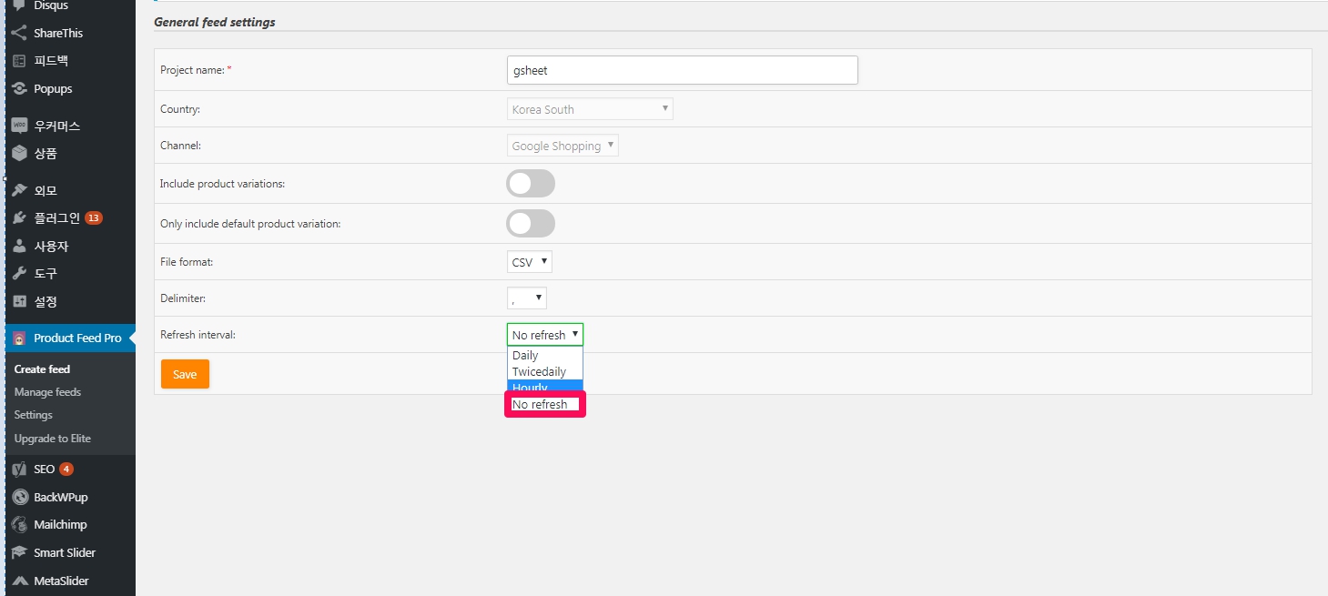 톱니바퀴 모양의 설정 버튼 아이콘을 click하시어 [General feed settings]으로 이동하신 후 refresh interval(피드 업그레이드 주기)를 [No refresh] 선택해주세요. 구글 쇼핑 피드가 구글 광고에 반영되는데는 하루정도의 시간이 필요한데, 이 플러그인이 매일 업그레이드하면 구글 광고에 반영되기 전에 새로운 피드가 업데이트되어 구글 광고가 제대로 처리를 하지 못합니다. 구글 광고에서 광고가 제대로 게시되면 매일(Daily) 등으로 변경해주세요.