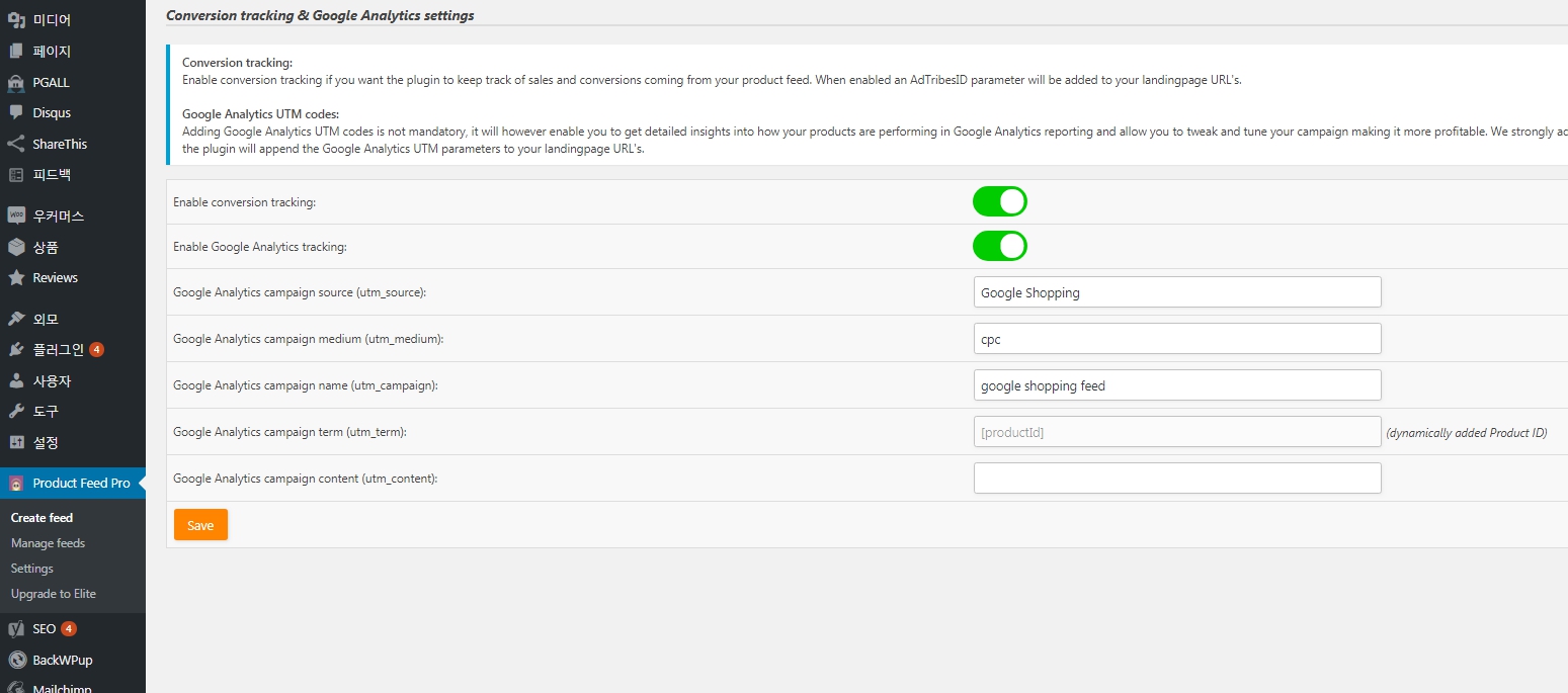 Product Feed PRO for WooCommerce 플러그인-사용법-5-전환 추적 및 Google 애널리틱스 설정