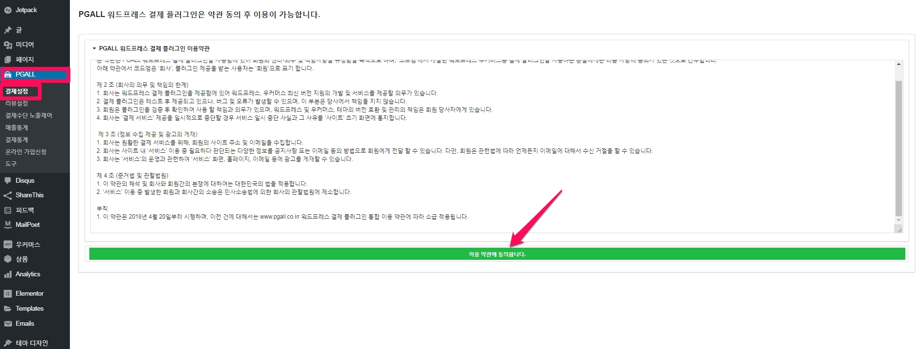 [PGALL] -> [결제설정]으로 이동하여 약관 동의후