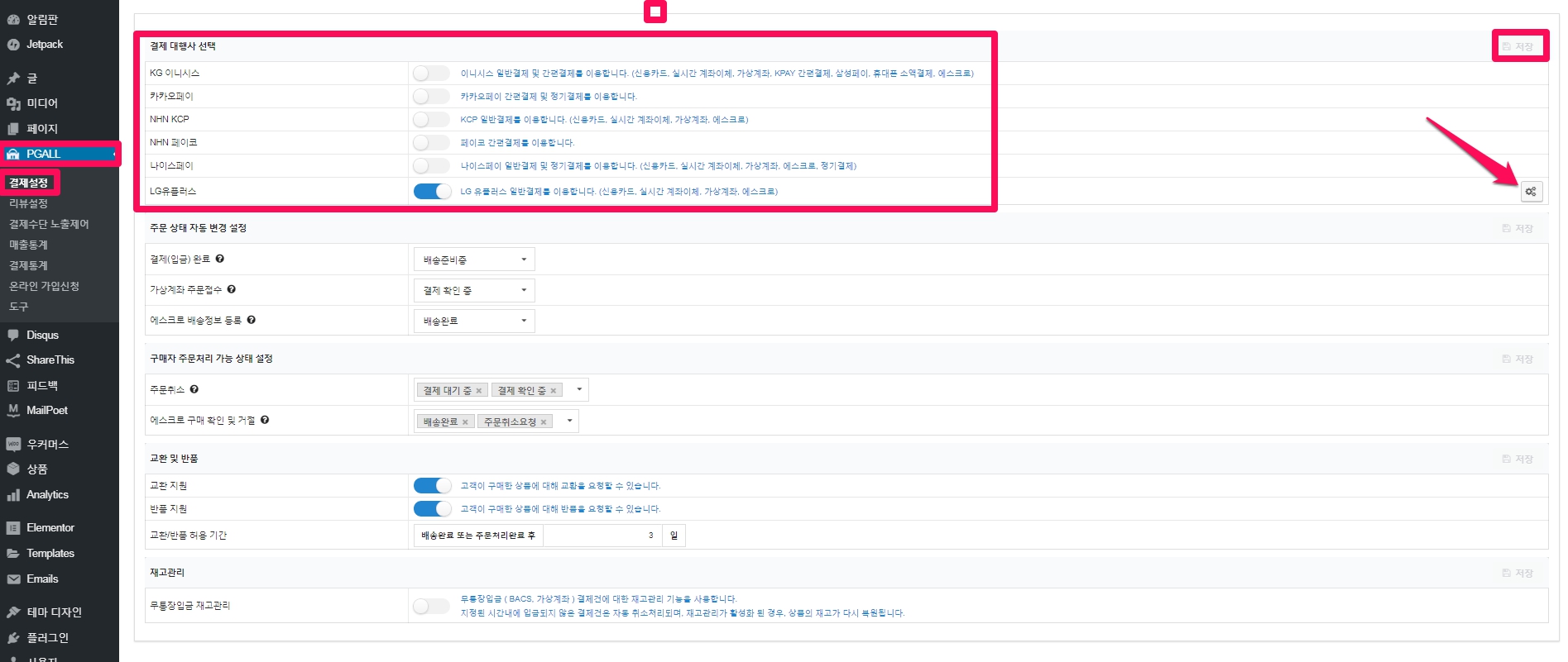 설정페이지에서 결제대행사(PG)사를 선택하여 활성화 및 저장해줍니다.