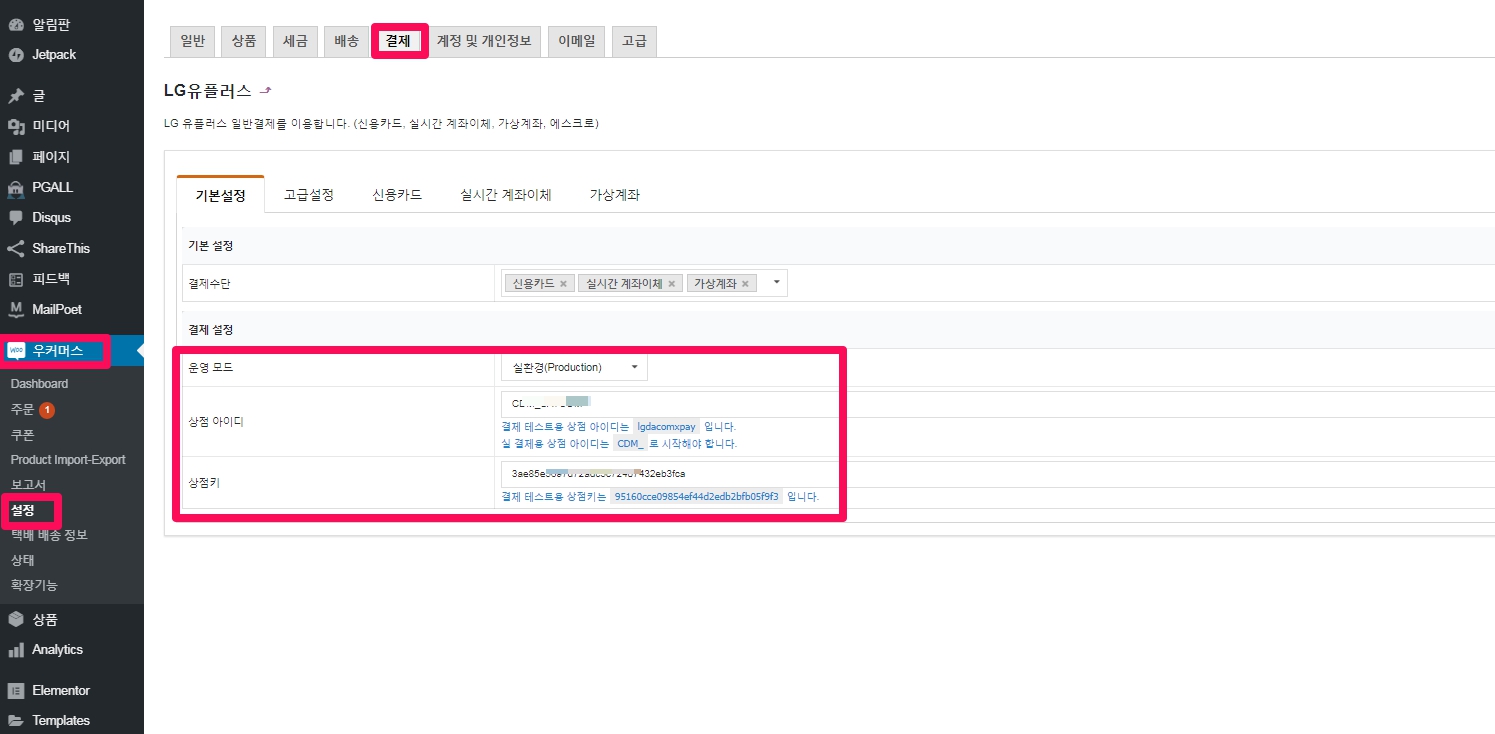 심사가 완료되면 PGALL 워드프레스 결제 플러그인으로 이동하시어 [개발환경(Sandbox)]을 [실환경(Production)] 으로 변경하신후, 부여받은 상점 아이디와 상점키(LG U+의 Mert Key값)를 입력하시면 상점 키파일 연동이 완료됩니다.