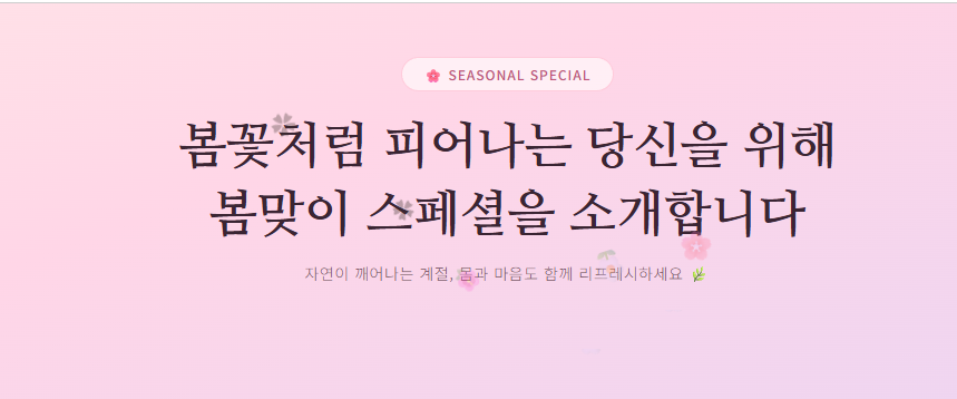 겨우내 움츠렸던 몸과 마음, 이제는 꽃처럼 활짝 피어날 시간이에요. 저희 마사지샵이 봄의 기운을 가득 담아 여러분을 맞이할 준비가 되어 있습니다. 자연이 주는 치유의 에너지와 함께, 올봄은 더욱 특별하게 시작해 보세요. 🌺
