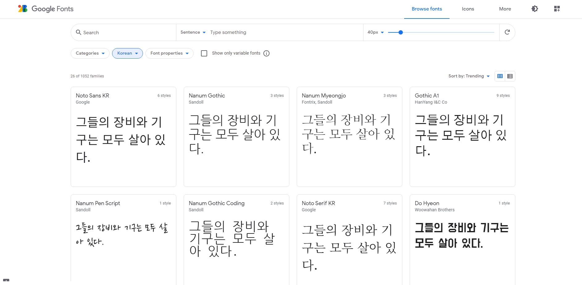 You can see how the fonts described above are displayed by setting the language to “Korean” in Google Fonts or by clicking https://fonts.google.com/?subset=korean.