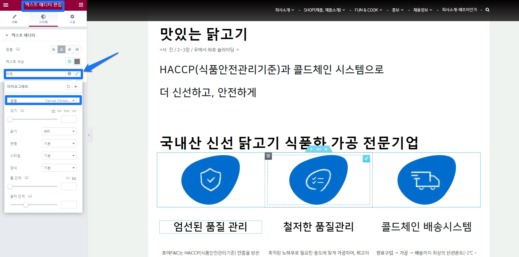 Note that when using elementor as the WordPress editor, the Korean font set in Rocket Font is not applied by default.